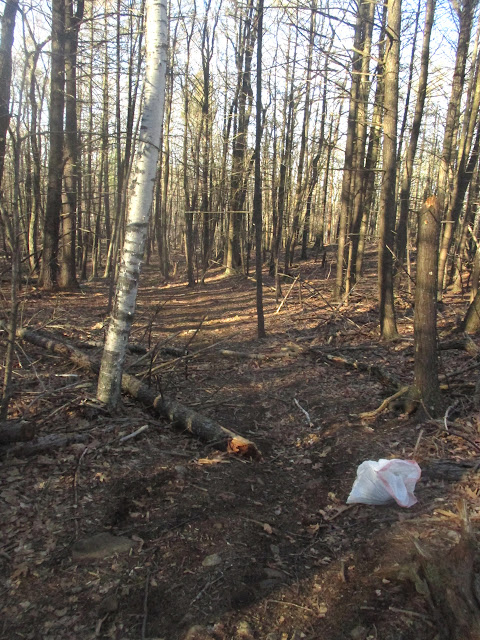 Those logs were cut by me in March from a tree which had fallen across the Blue Trail. Of course, I was smart enough to toss them off-trail, so SOMEBODY was evil enough to put them across the trail.